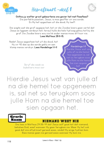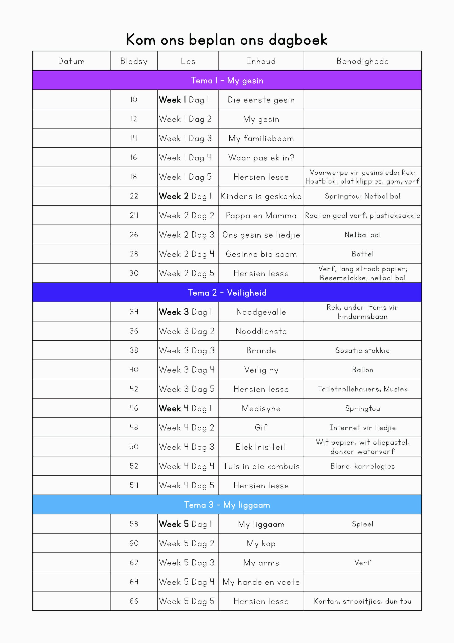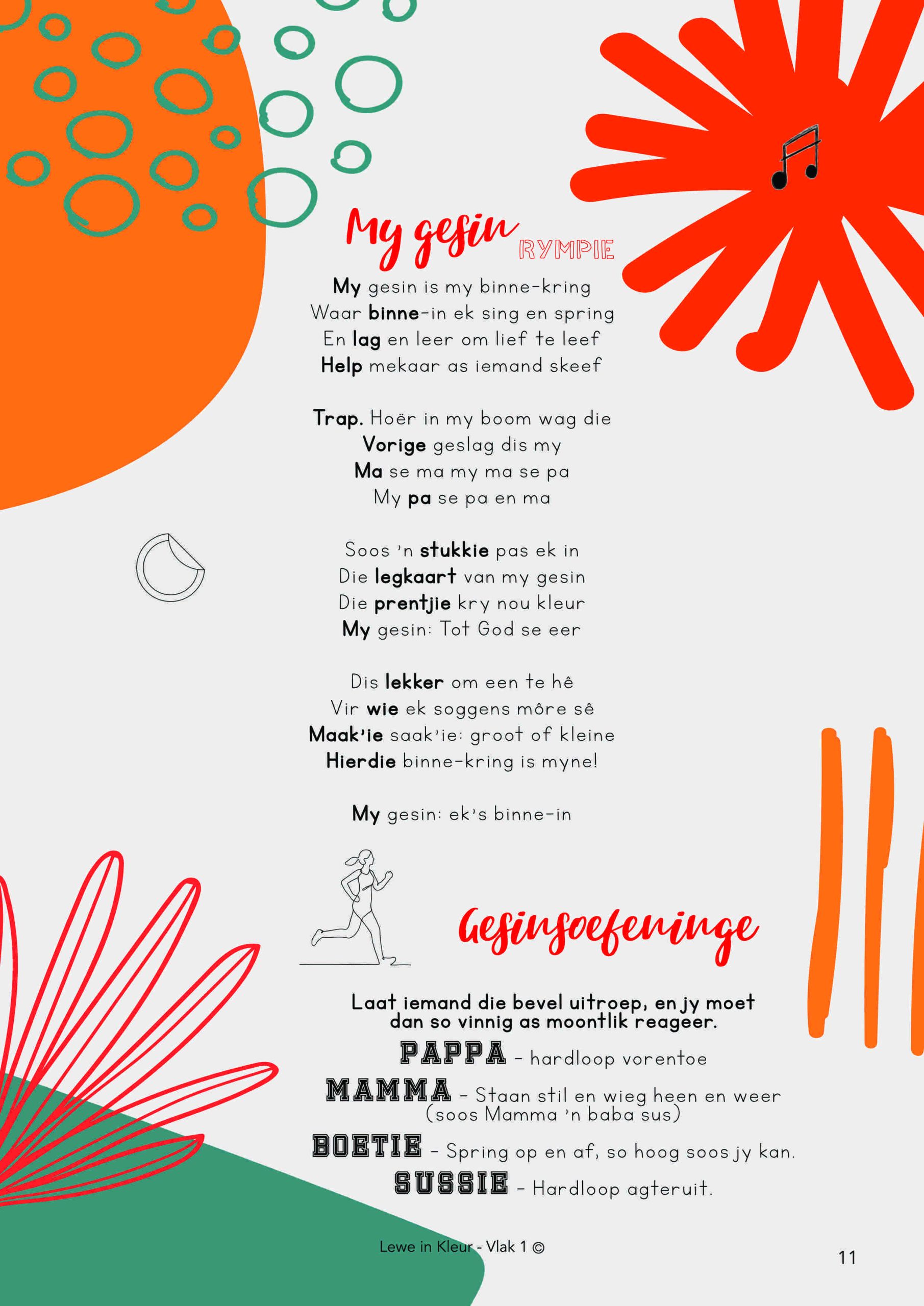 ‘n Kleurvolle, prettige boek propvol lekker aktiwiteite rondom die temas My gesin; Veiligheid; My liggaam; en Beskerm my liggaam. Daar is ook ‘n Week-temastudie oor Hemelvaart en Pinkster.