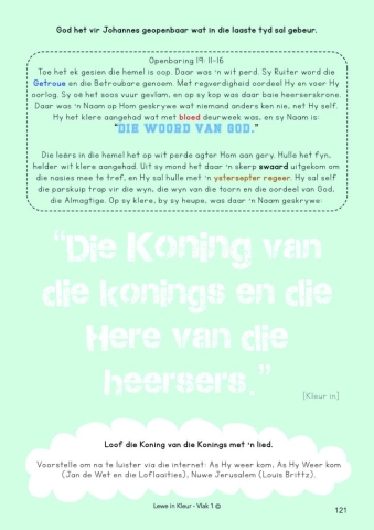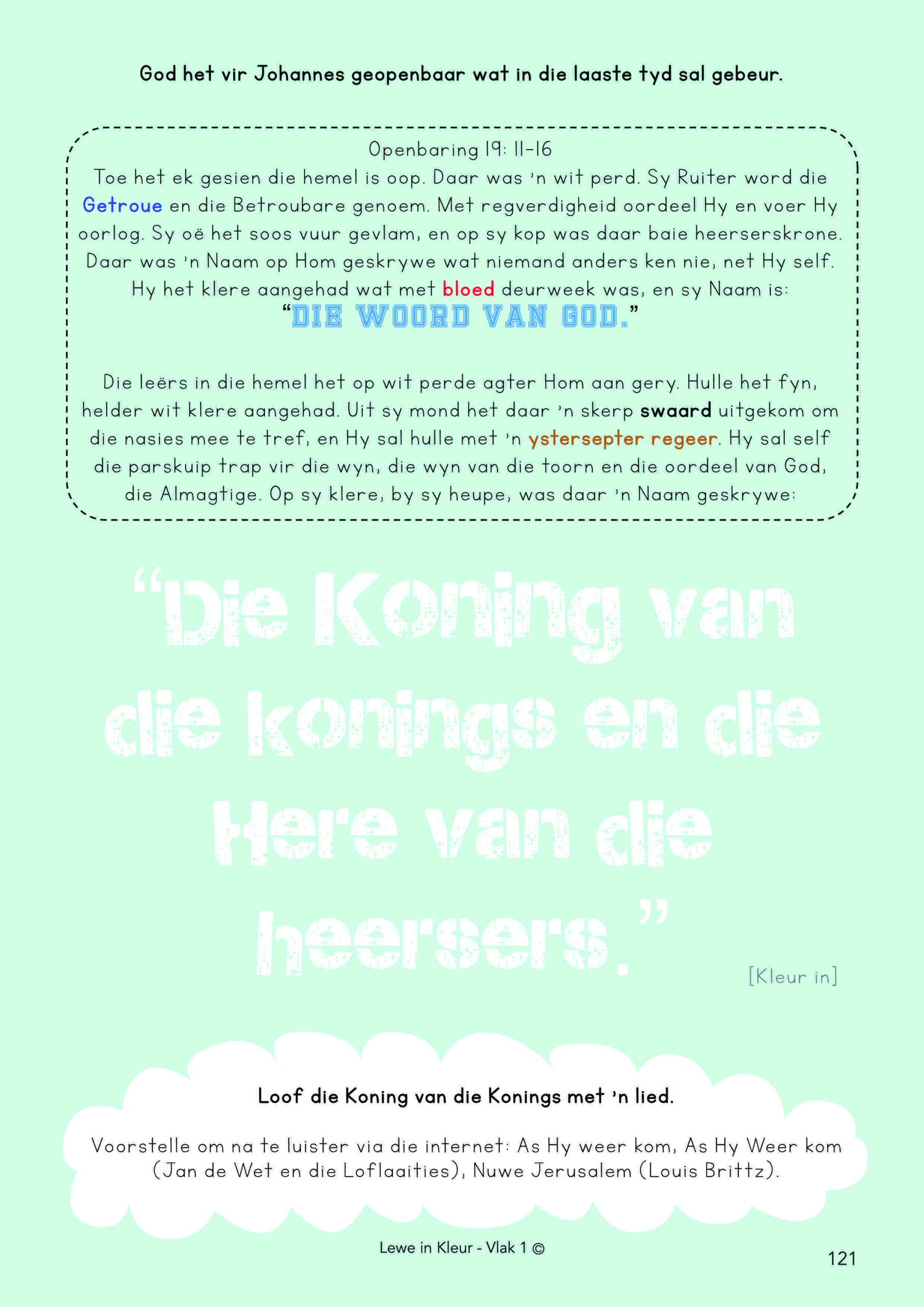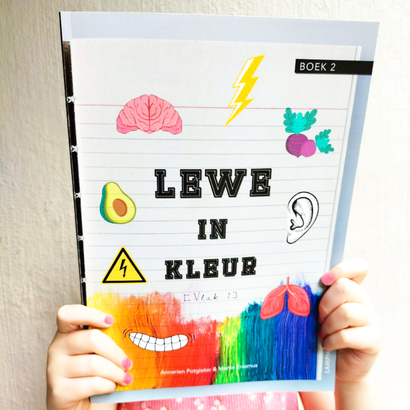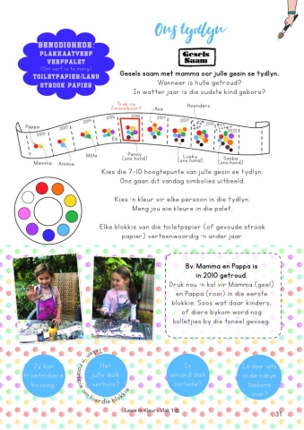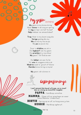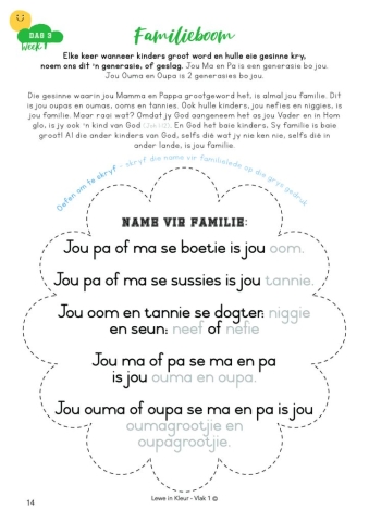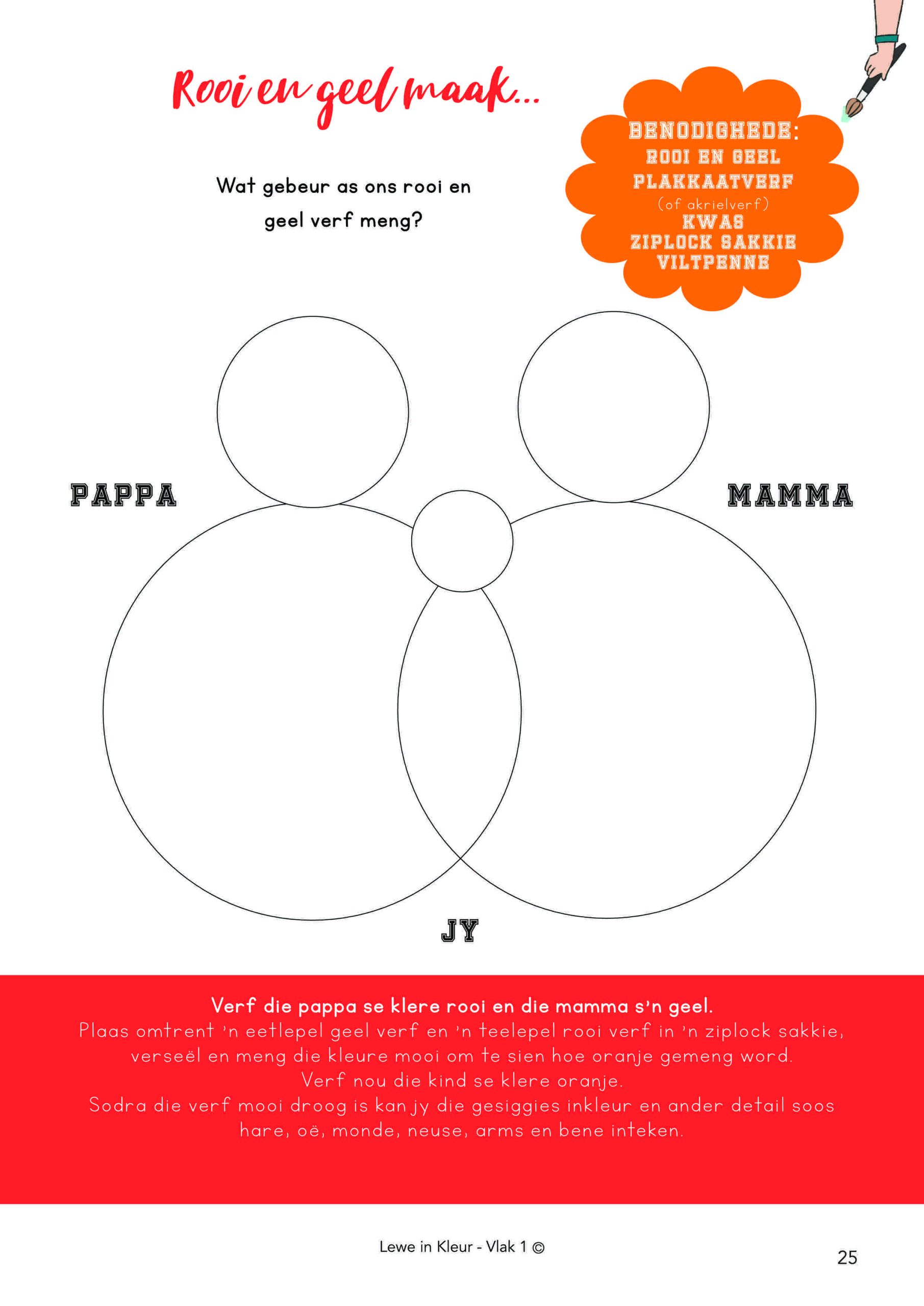 ‘n Kleurvolle, prettige boek propvol lekker aktiwiteite rondom die temas My gesin; Veiligheid; My liggaam; en Beskerm my liggaam. Daar is ook ‘n Week-temastudie oor Hemelvaart en Pinkster.
