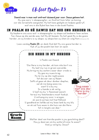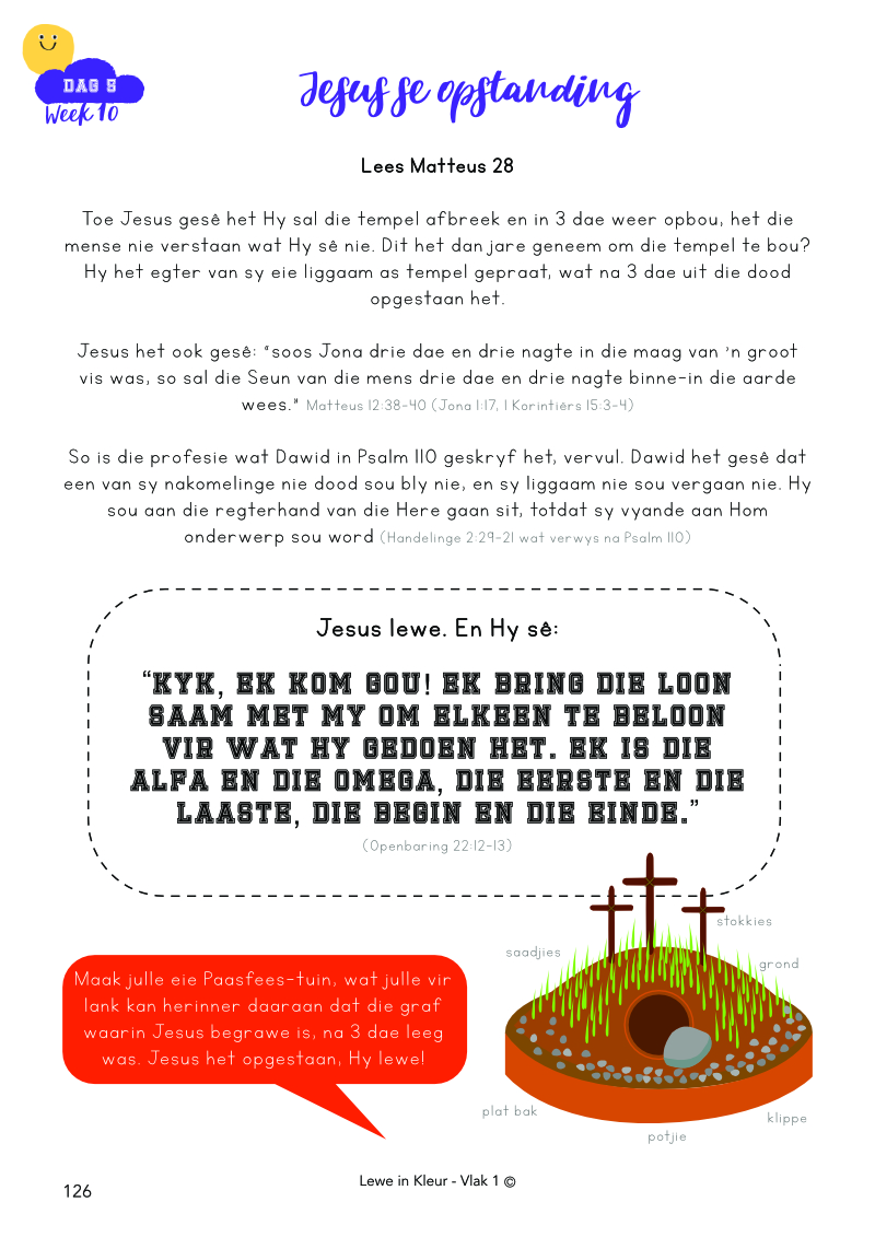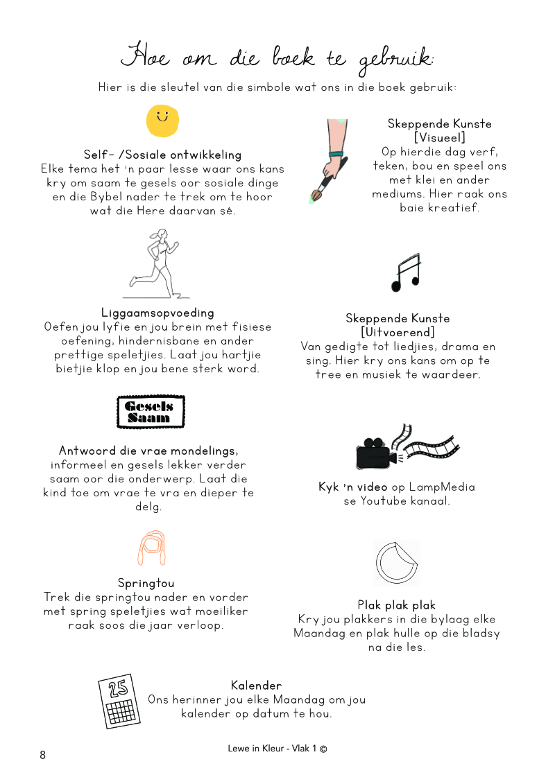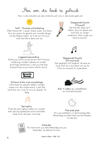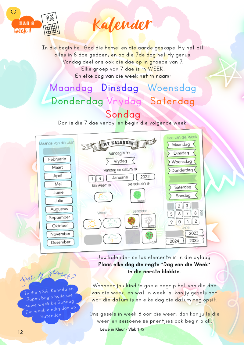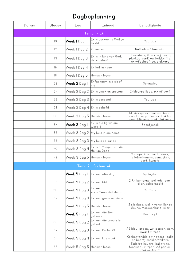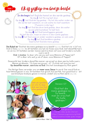 Daar is ‘n les vir elke dag, vir 10 weke, en is geskik vir 6-8 jariges.