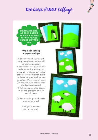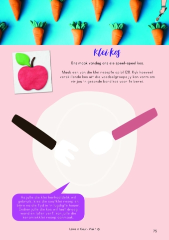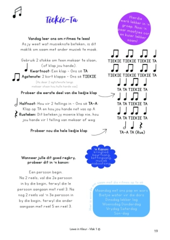 ‘n Kleurvolle, prettige boek propvol lekker aktiwiteite rondom die temas Wie is ek? So leer ek;  Gesonde eetgewoontes; en Die Weer. Daar is ook ‘n Week-temastudie oor Paasfees.