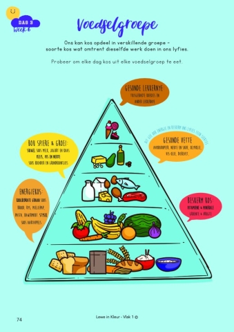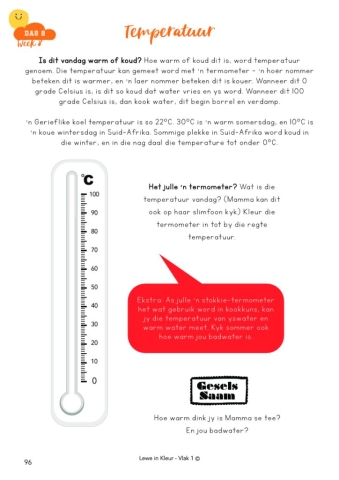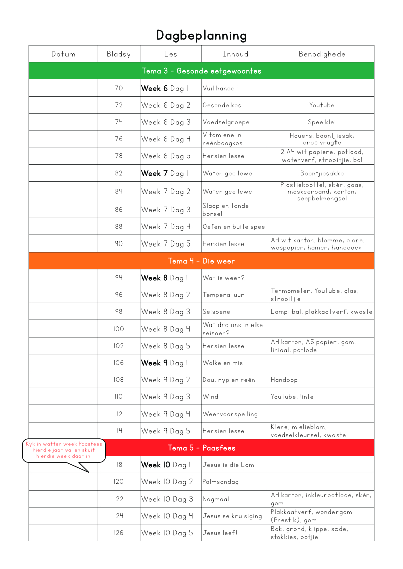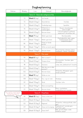 50 lesse rondom die temas: Wie is ek? So leer ek;  Gesonde eetgewoontes; en Die Weer.