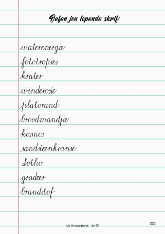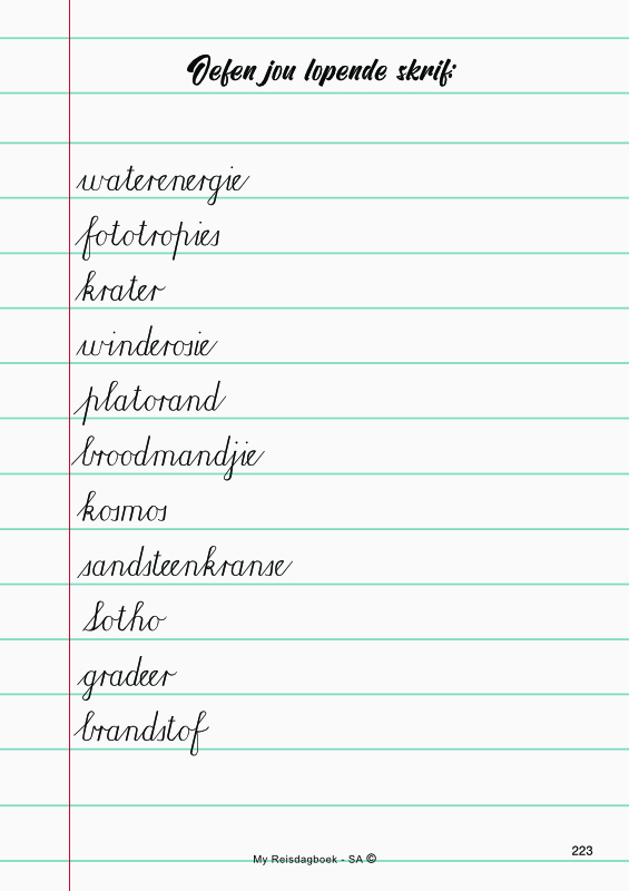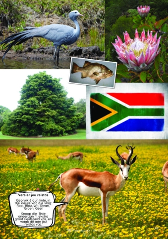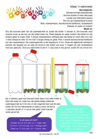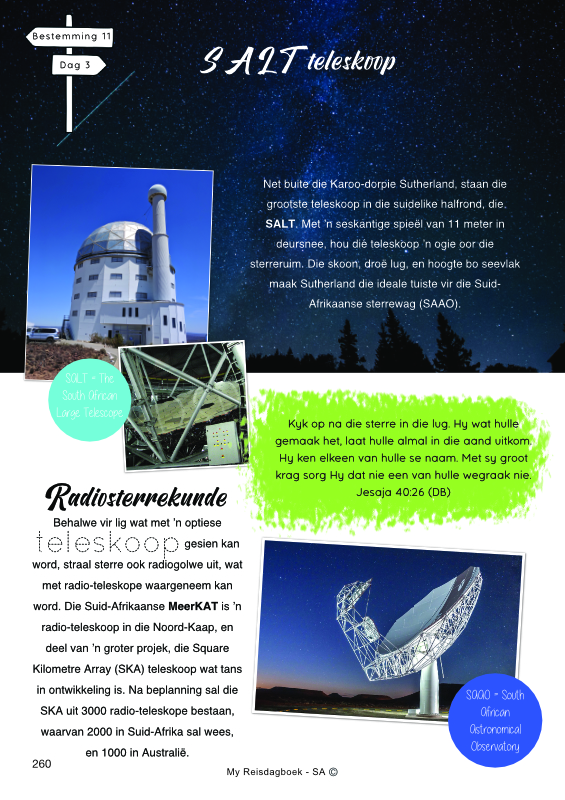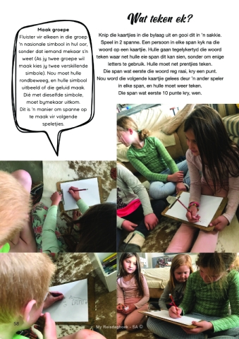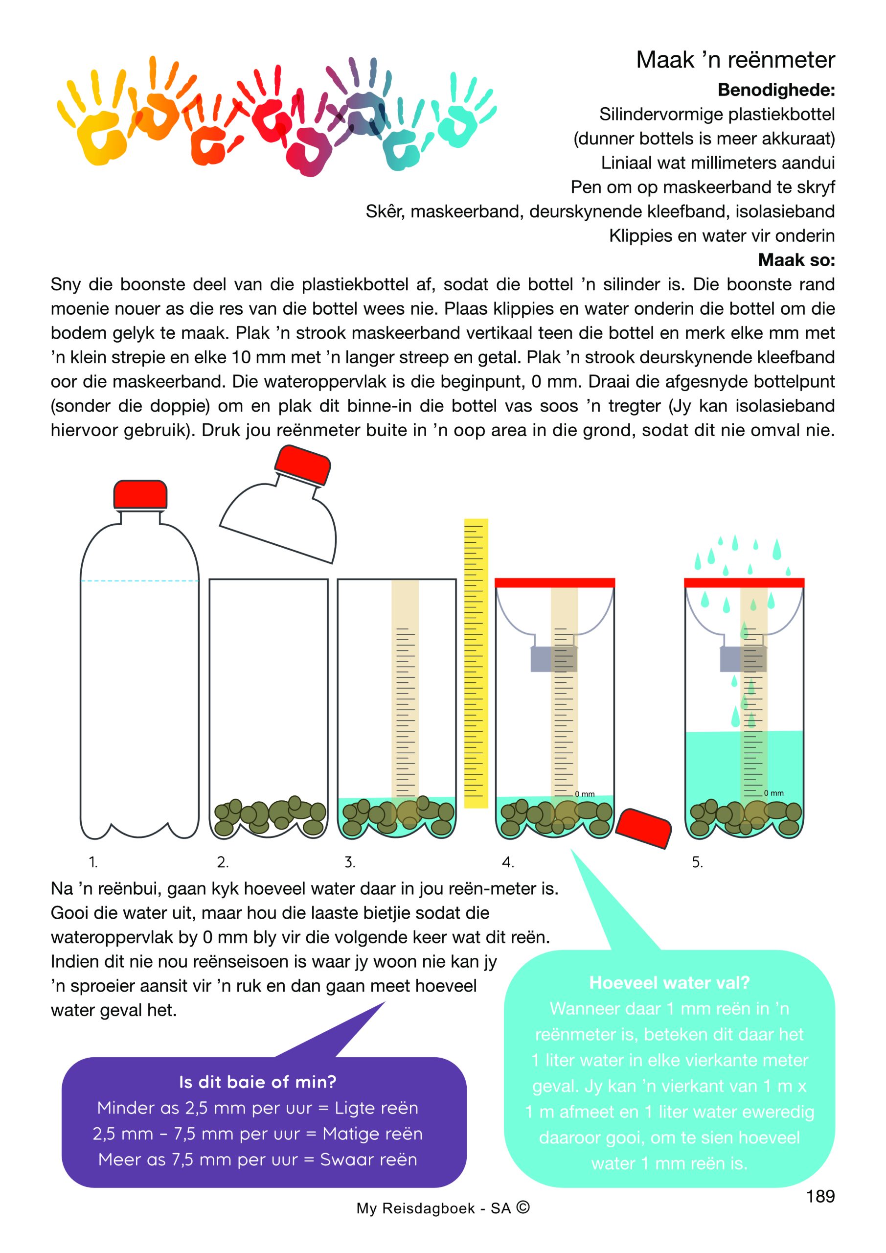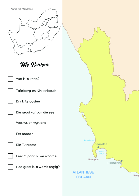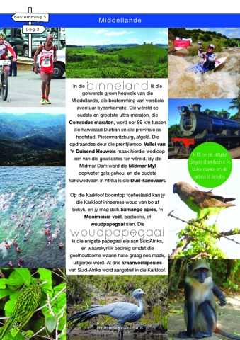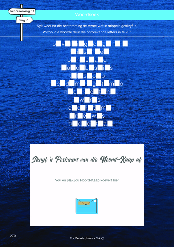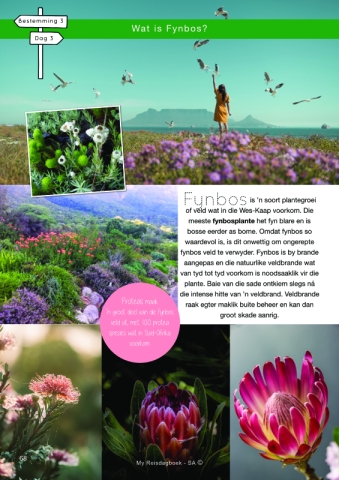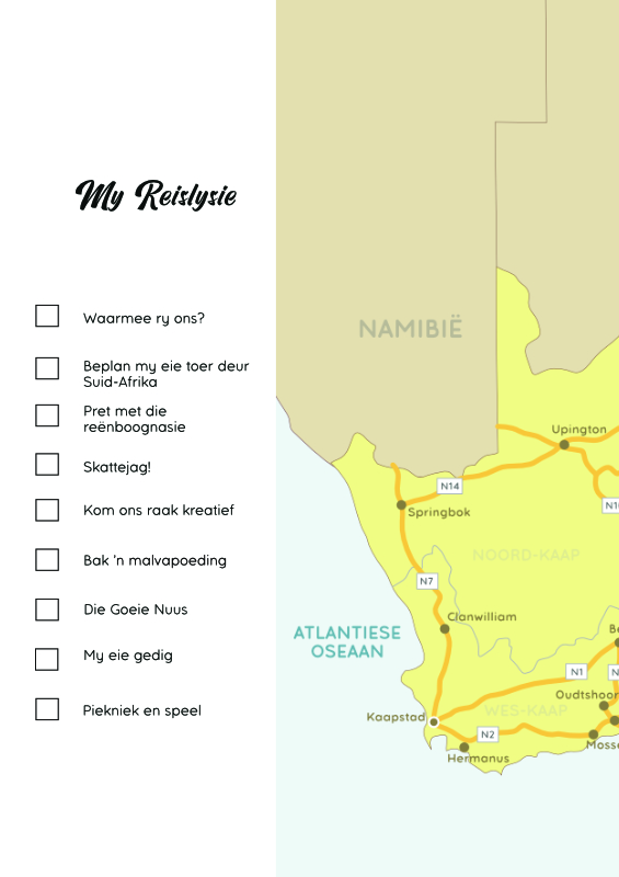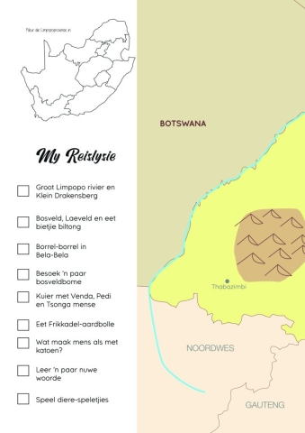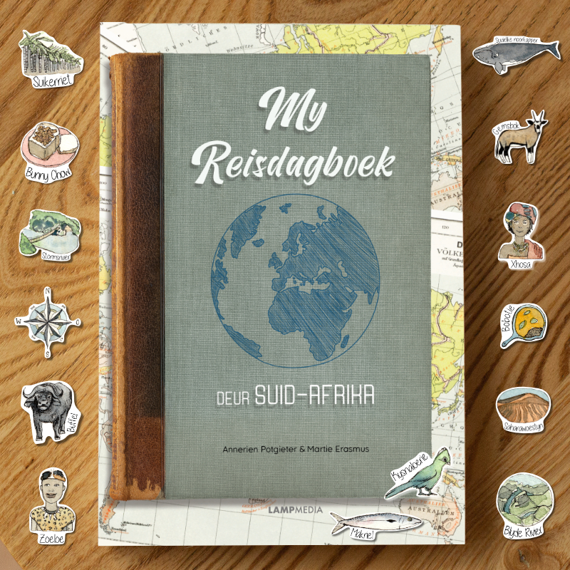 Die Teerpad Reis sluit in: My Reisdagboek, pdf Poskaarte, en ‘n stel plakkers. Kyk hier na die verskillende bundels, en blaai hier deur die boek.